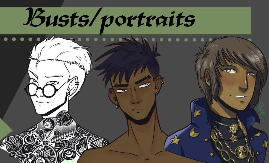 Prices for Portaits, Half bodies, and Full bodies are per character.I am able to draw original character designs, fanart of existing characters, self inserts, and anthropological characters.Complex or extravagant designs may increase the price.