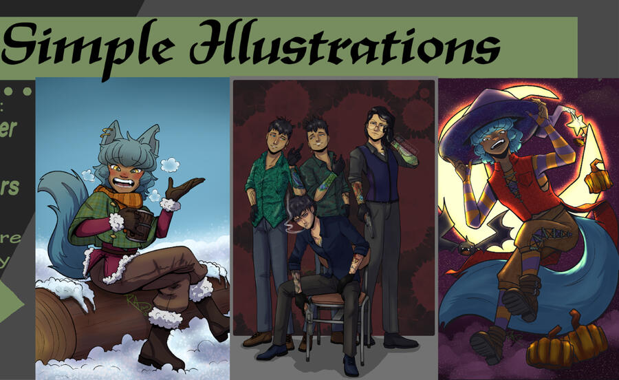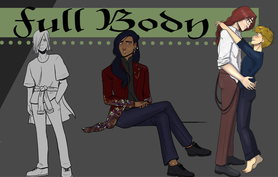 Prices for Portaits, Half bodies, and Full bodies are per character.I am able to draw original character designs, fanart of existing characters, self inserts, and anthropological characters.Complex or extravagant designs may increase the price.